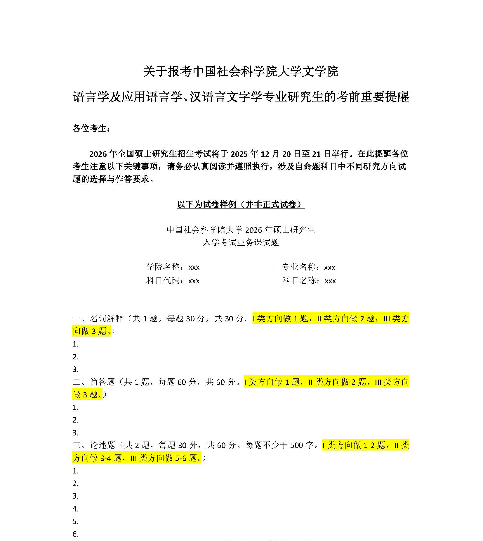 关于报考中国社会科学院大学文学院语言学及应用语言学、汉语言文字学专业研究生的考前重要提醒
