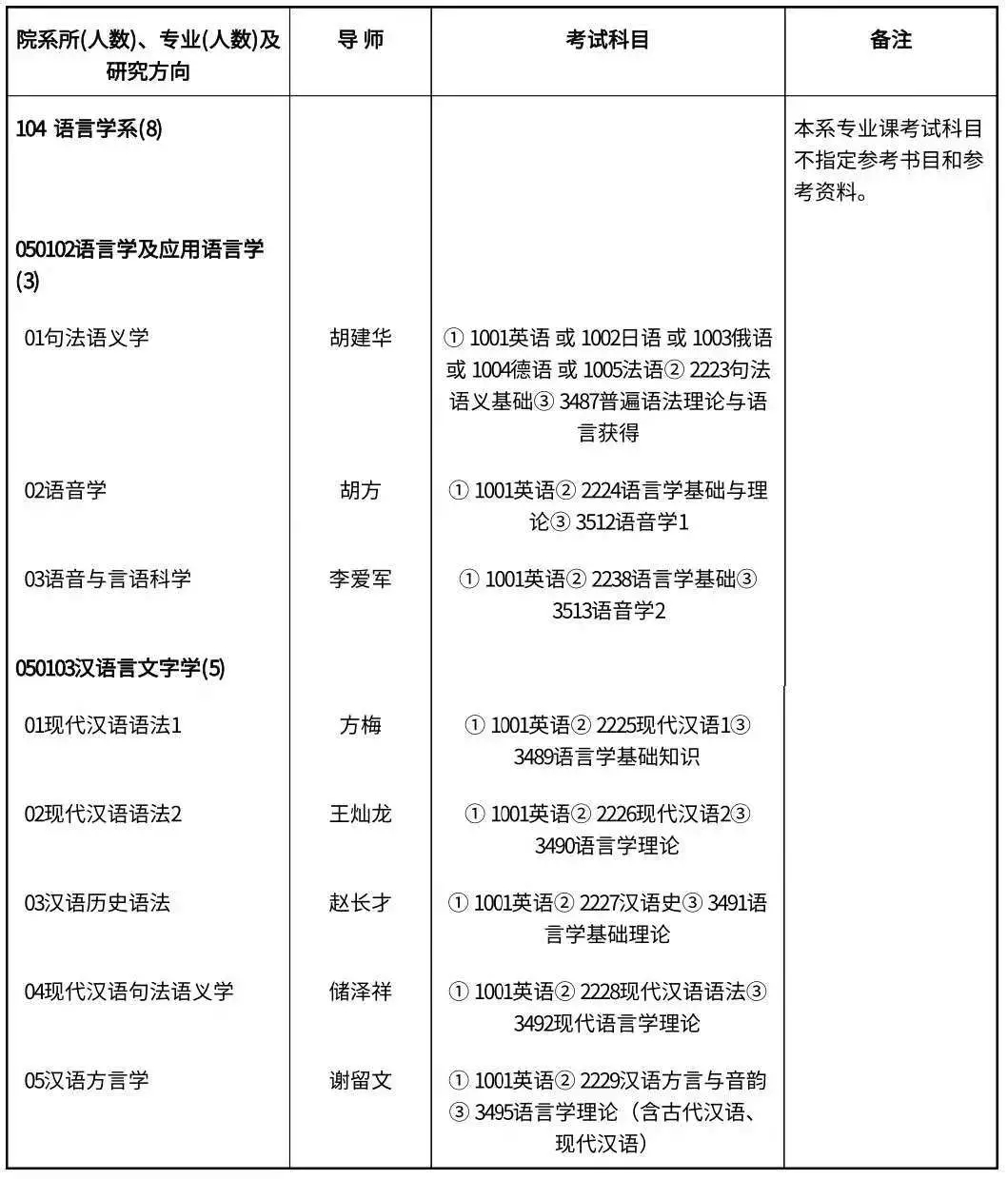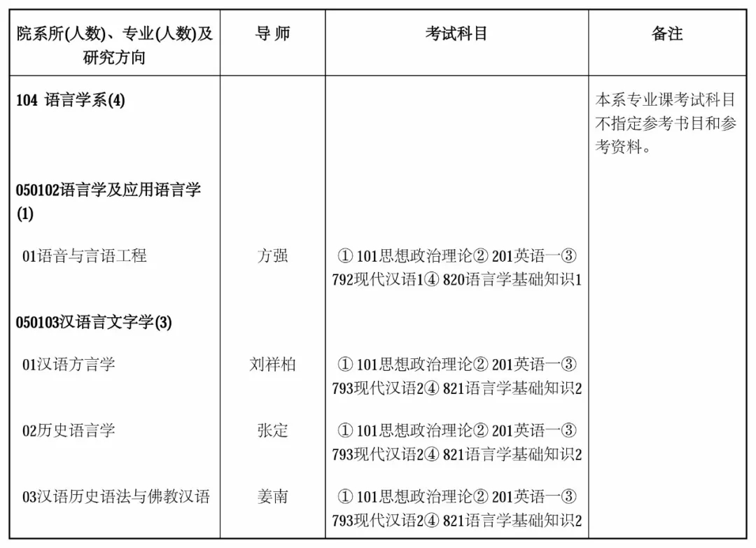 104语言学系(4人).④821语言学基础知识2备注:本系专业课考试科目不指定参考书目和参考资料。