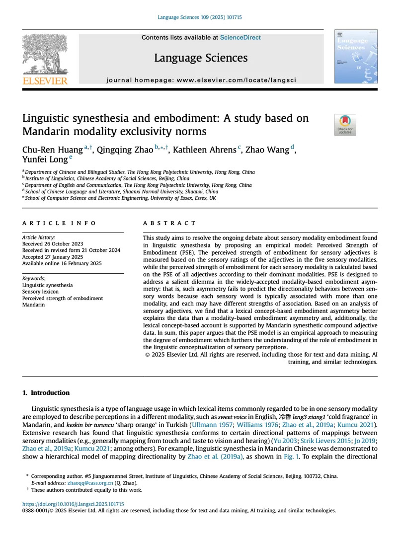 Huang, Chu-Ren, Qingqing Zhao*(赵青青,共同一作、通讯作者), Kathleen Ahrens, Zhao Wang & Yunfei Long. 2025. Linguistic synesthesia and embodiment: A study based on Mandarin modality exclusivity norms. Language Sciences (109): 101715.(SSCI)