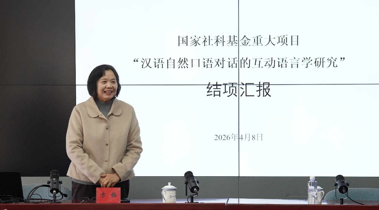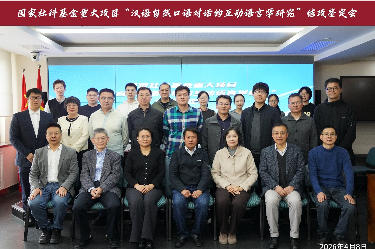 2026年4月8日,国家社科基金重大项目“汉语自然口语对话的互动语言学研究”结项鉴定会在中国社会科学院语言研究所顺利举行。语言研究所党委副书记、副所长(主持所务工作)王锋、院科研局项目管理处负责人杨振出席会议;来自教育部语言文字应用研究所、首都师范大学、南开大学、中国人民大学、北京语言大学等单位的五位评审专家、项目首席专家方梅研究员带领的各子课题负责人及部分课题组成员参加了会议。会议由语言研究所科研处处长张骅主持。