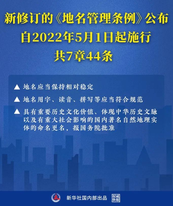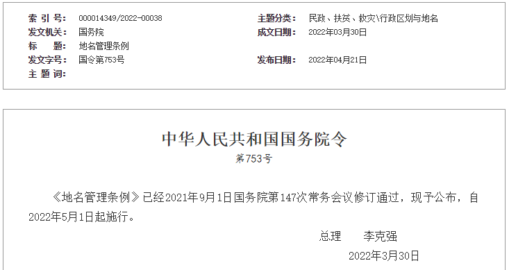 《地名管理条例》已于日前完成修订,自2022年5月1日起施行。修订后的条例共7章44条,对地名管理作出了全面、系统的规定。