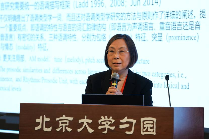 李爱军研究员(中国社会科学院语言研究所)作题为《语调类型学视角下的汉语方言语调研究》的大会报告。她从跨语言比较的角度阐述语调类型学的理论框架,指出语调研究需在统一的描写体系下考察功能和形式上的异同。科研团队构建的中国语调韵律库 INTO-CASS覆盖字、词、句等多层次语料,为类型学研究提供了坚实的数据基础。报告基于AM(自主节律)理论和双要素语调模型,分析了汉语方言中声调与语调的互动模式,并以“共存—顺服—阻断”三类模式揭示语调与词汇韵律的系统性关系。报告还介绍了结合GCA、GAMM、FPCA等统计建模方法的语调分析范式,并以陈述与疑问句的边界调和焦点韵律为例,展示了声调语言中语调实现的多样机制,为汉语语调研究提供了新的理论与方法路径。报告末尾,曹梦雪副研究员(中国社会科学院语言研究所)展示了“中国社会科学院多模态语言资源平台”的建设情况,并呼吁学界积极推动语言研究资源的开放共享。
