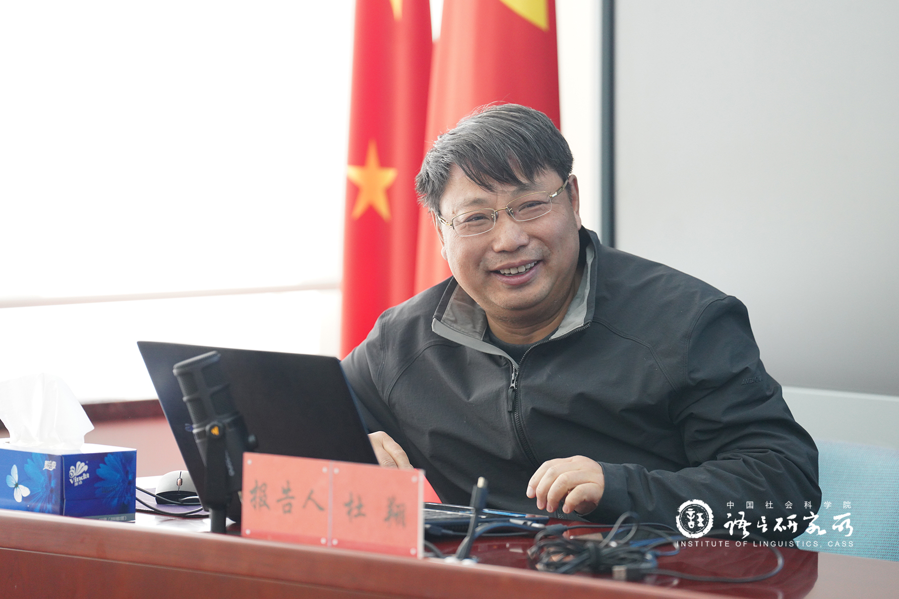 词典编辑室杜翔研究员作了题为《词语的形义、音义适配》的学术演讲。他从四个方面探讨了汉语词汇形义、音义适配的类型,即:(一)形义适配(有分儿/有份儿,人形/人型机器人,后备箱/厢,熔化/溶化/融化,品位/品味);(二)音义适配(拚却/拼却,黏人/粘人,比画/比划,啊/哦,古诗文读音);(三)异形词分化(板块/版块,翔实/详实,凝练/凝炼);(四)误用与创新(厎定/底定/砥定乾坤,豆蓉/豆茸)。