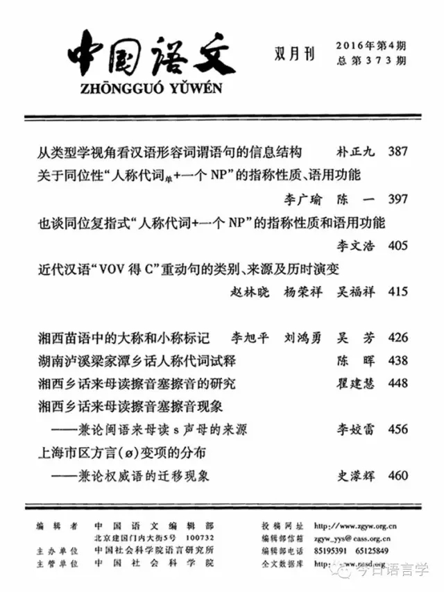《中国语文》2016年第4期(总第373期)于7月10日由社会科学文献出版社出版。
