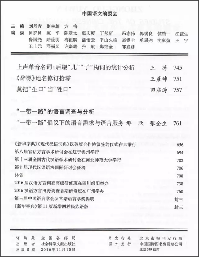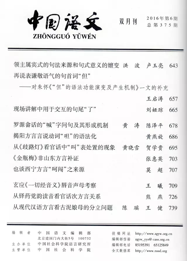 《中国语文》2016年第6期(总第375期)于11月10日由社会科学文献出版社出版。