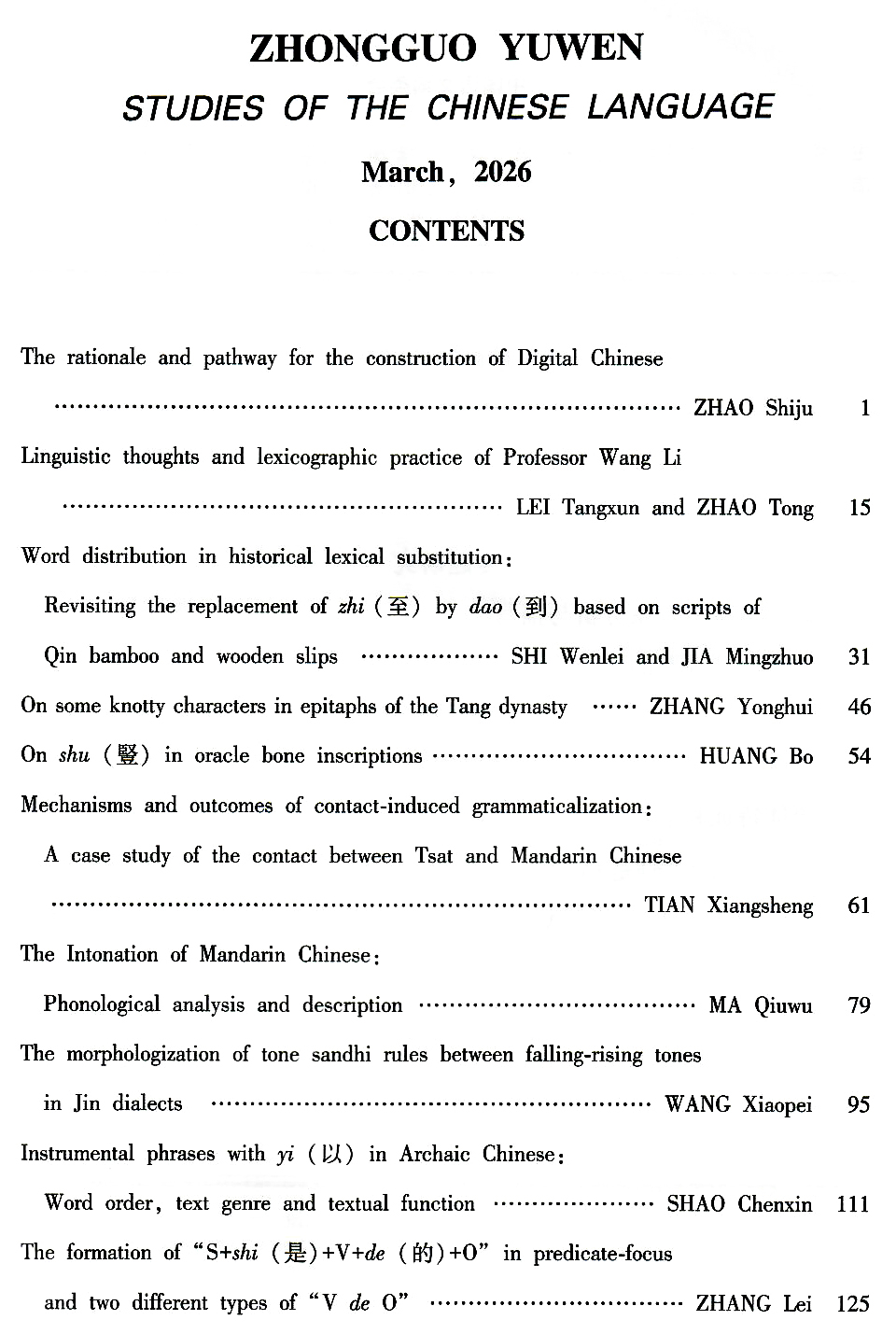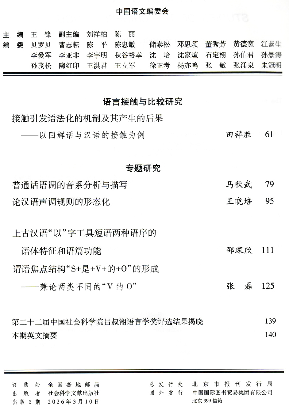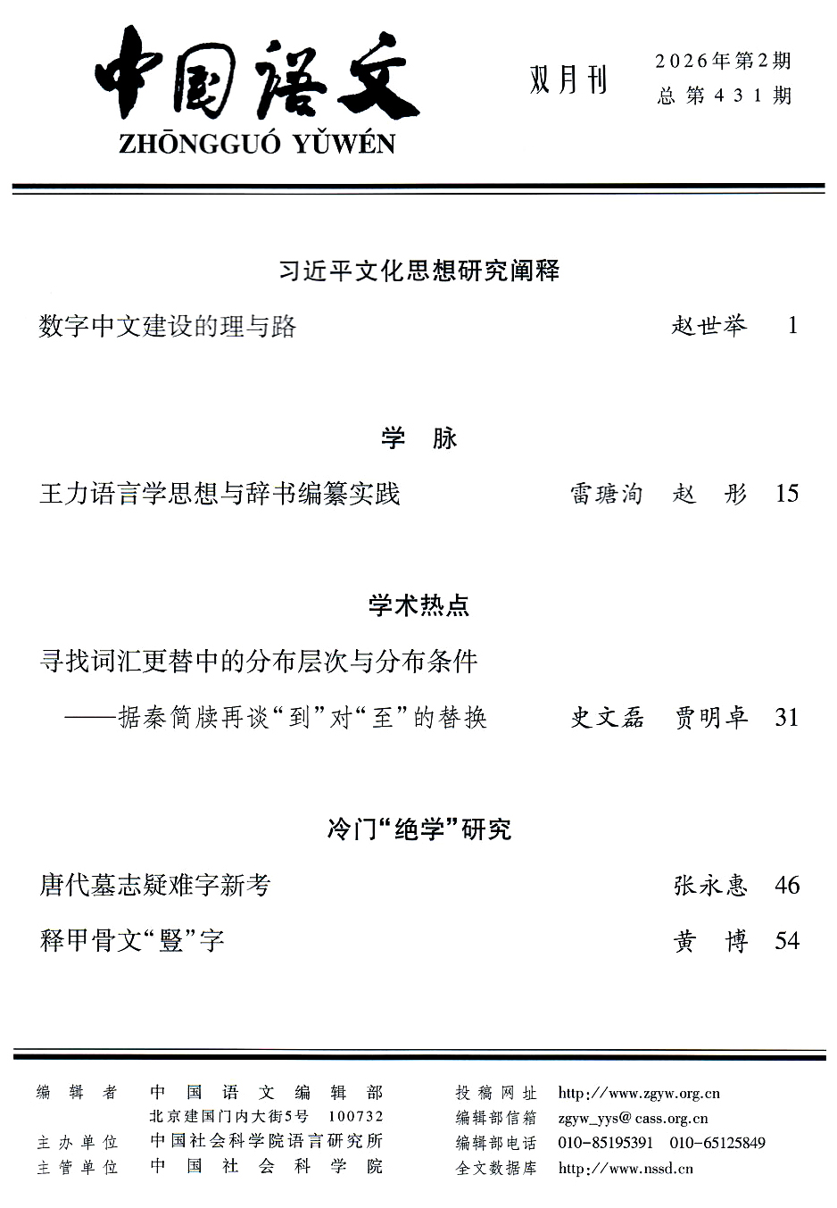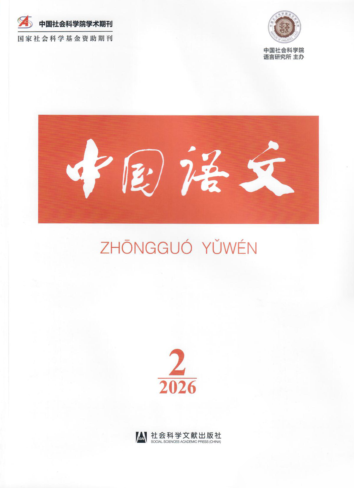 《中国语文》2026年第2期于2026年3月10日由社会科学文献出版社出版。